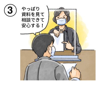 一番多くの方にご利用いただいてます。気持ちを直接伝えて頂きやすく、ストレスの少ない相談方法です。資料を見ながら、より具体的に詳しいお話と解決策のアドバイスが可能です。